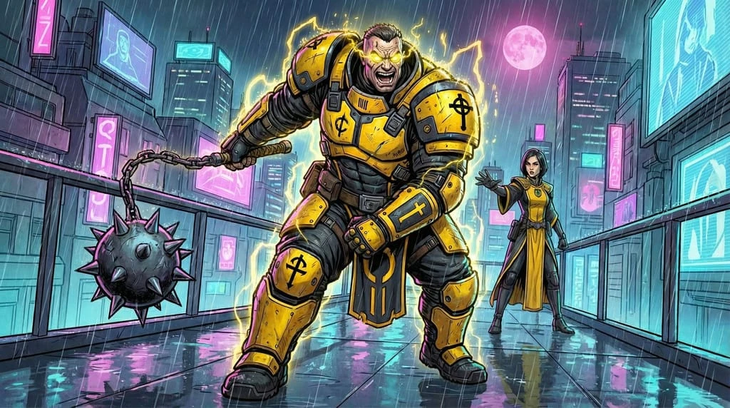 Aesthetic: Cyber-cathedrals, heavy robes, religious icons.